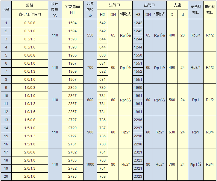 储气罐参数: